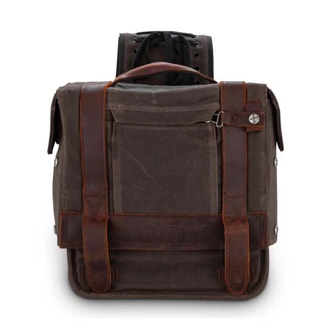 Voyager Throw-Over från Burly är ett par universella sidoväskor som finns i svart Cordura eller dark oak vaxad canvas. Väskorna är förstärkta med läderpaneler för en klassisk look och har en metall- och polyetenram invändigt som gör att de behåller formen, oavsett om de är fulla eller tomma. Bredden är justerbar för att passa olika skärmbredder och rullstängningen med Snap/Velcro Road Shield-system skyddar mot väder och vind.