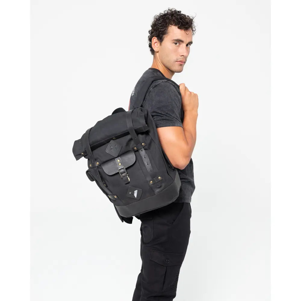 Oasis II motorcykelryggsäcken kombinerar klassisk stil med modern funktionalitet. Tillverkad av vattenavvisande vaxad bomull och högkvalitativt läder. Den har två ytterfickor för snabb åtkomst, ett innerfack för dokument eller en bärbar dator och en sidodragkedja för enkel åtkomst till huvudfacket. Reflekterande material på handtagen på baksidan förbättrar synligheten, medan förstärkta sömmar garanterar hållbarhet både på och av motorcykeln. Med en kapacitet på 14,7 liter är den praktisk för daglig användning och resor.