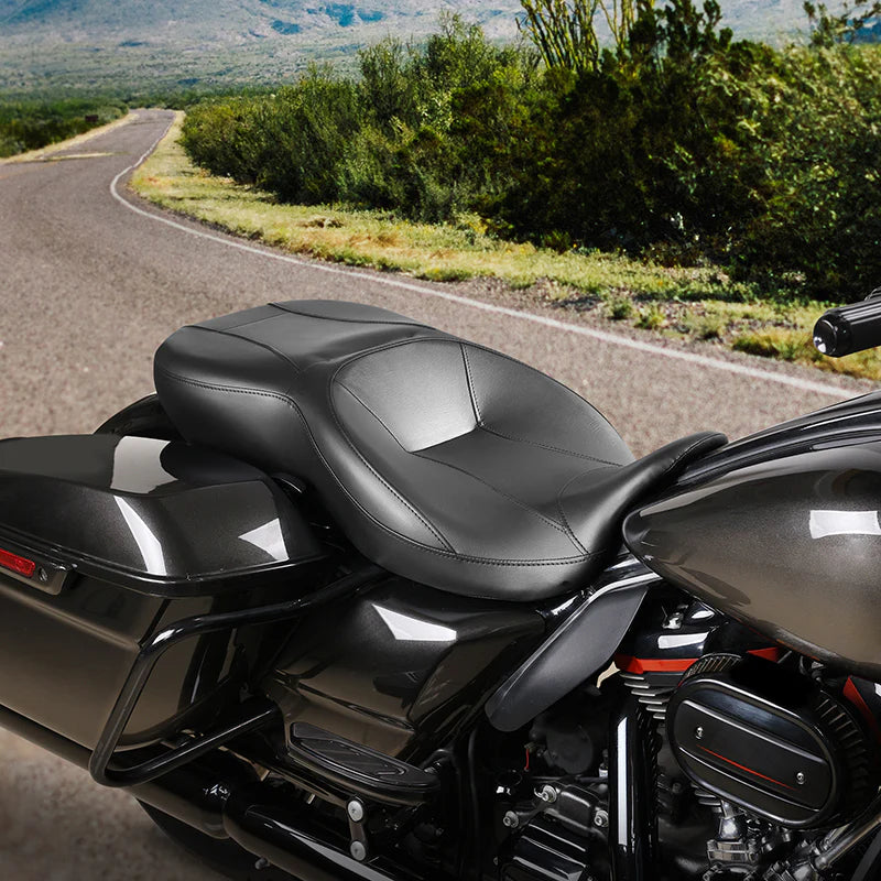 Denna 2-up touring sadel flyttar föraren något bakåt för en mer avslappnad körställning och passar särskilt bra för längre förare. Den breda förardelen ger bra stöd för höfter och rygg, medan passagerardelen är jämnt formad för stabil komfort även under längre turer.
