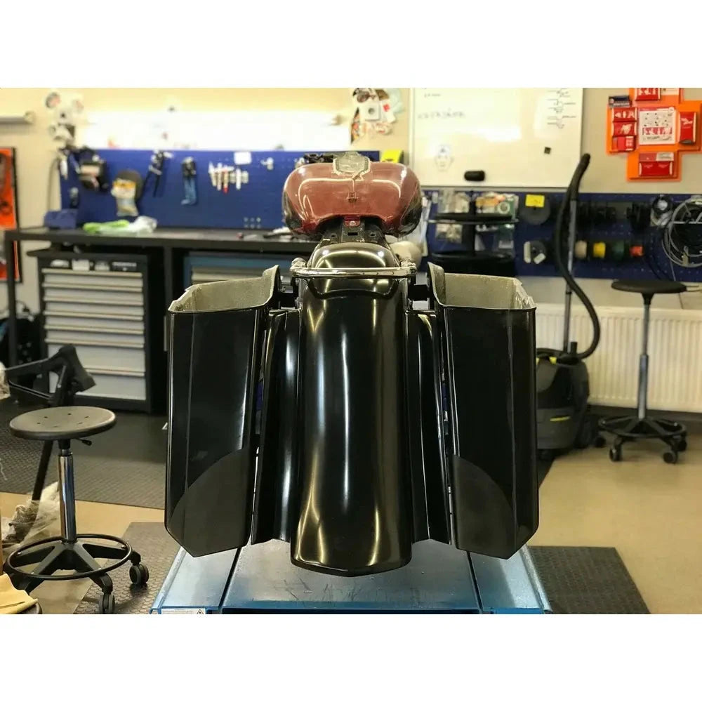 Sats med sidoväskor och skärm som ger hojen ett förlängt customutseende med 5" nedförlängning och 7" stretchad profil. Sidoväskorna är direkt ersättning för originalväskorna och återanvänder befintliga lock och monteringsdetaljer. Både väskor och skärm är förberedda med förborrade hål för enklare montering och tillverkade i handupplagd glasfiber med svart gelcoat för styrka, stabilitet och låg vikt.