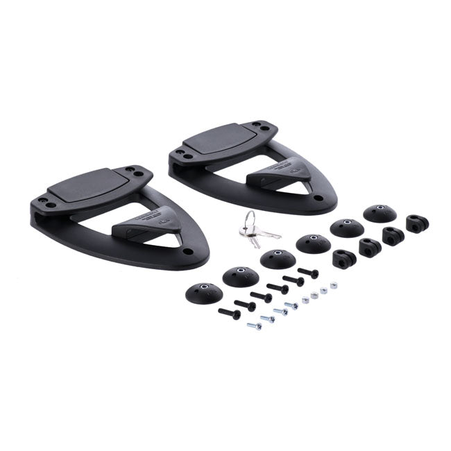 Varje väska levereras med en Click-On-enhet som monteras på baksidan av väskan och klickas fast i väskstöden på motorcykeln (säljs separat här). Fästena finns som modellanpassade eller universella versioner. Väskorna kan även användas utan Click-On-systemet om så önskas.
