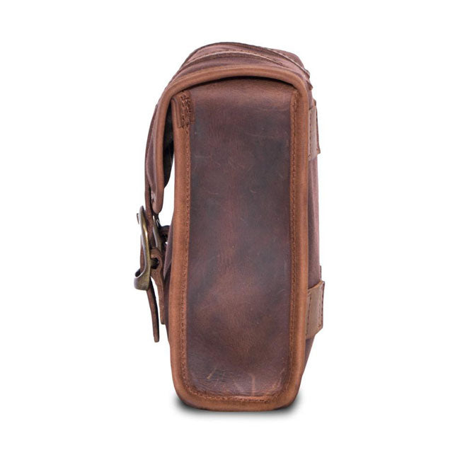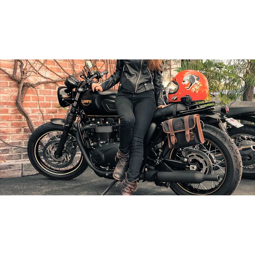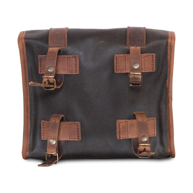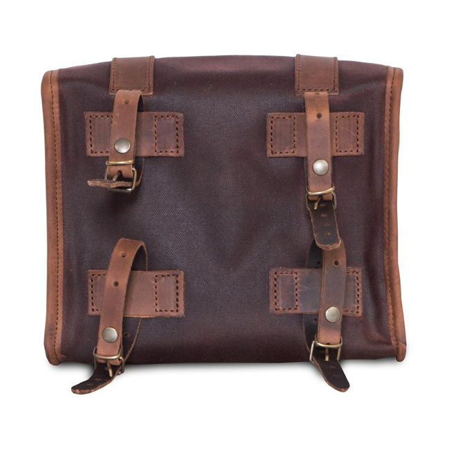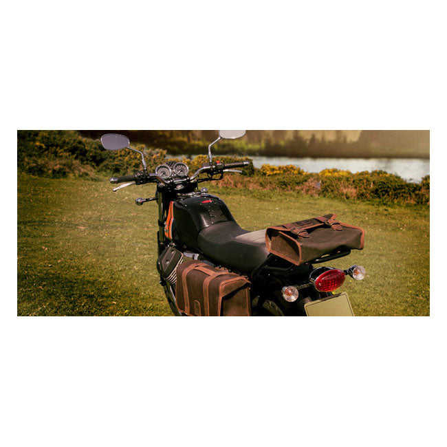 Mini Ammo är en kompakt sidoväska i vintagestil, handgjord i 22 oz vaxad bomullscanvas och vegetabilgarvat fullnarvsläder. Den rymmer 4 liter, är vattenavvisande och får ett vackert åldrat utseende med tiden. Perfekt för klassiska och retroinspirerade motorcyklar.