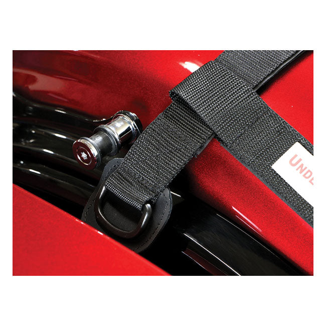 Nelson Rigg Route 1 Under Seat väskinfästning är en smart lösning för motorcyklar utan sissy bar eller pakethållare. Den monteras under passagerarsadeln och skapar fyra säkra fästpunkter för packremmar. Med slitstarka material och skyddande baksida hålls packningen stabil samtidigt som hojen skyddas mot repor.
