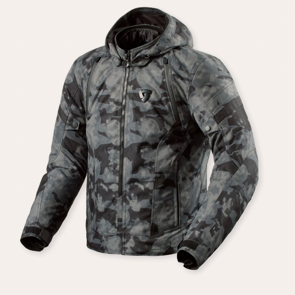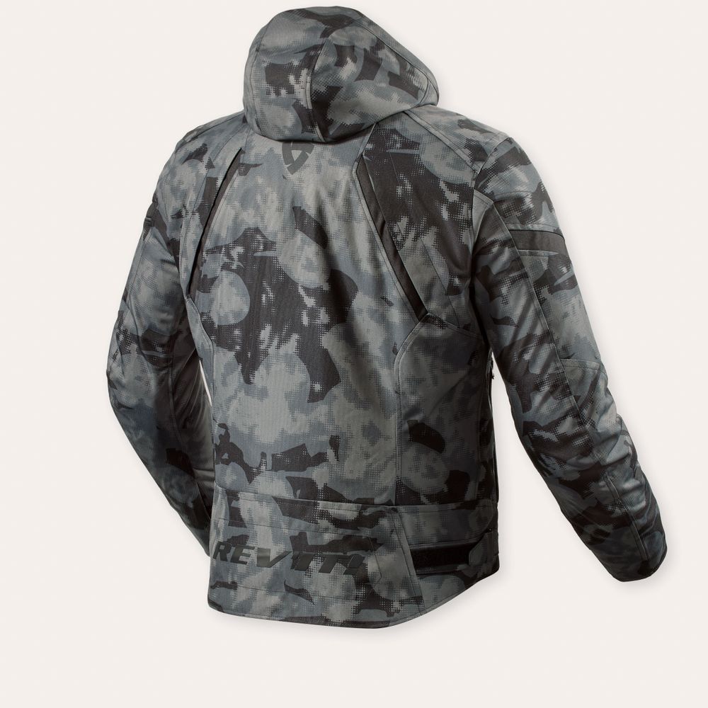 REV'IT! Flare 3 H2O motorcykeljackan blandar modern streetwear-stil med skydd och väderbeständighet. Med en djärv kamouflagedesign, vattentäthet och en avtagbar huva är den redo för körningar i oförutsägbara förhållanden. Dolda ventilationsdragkedjor och återvunna material gör den här jackan lika funktionell som framåtblickande.