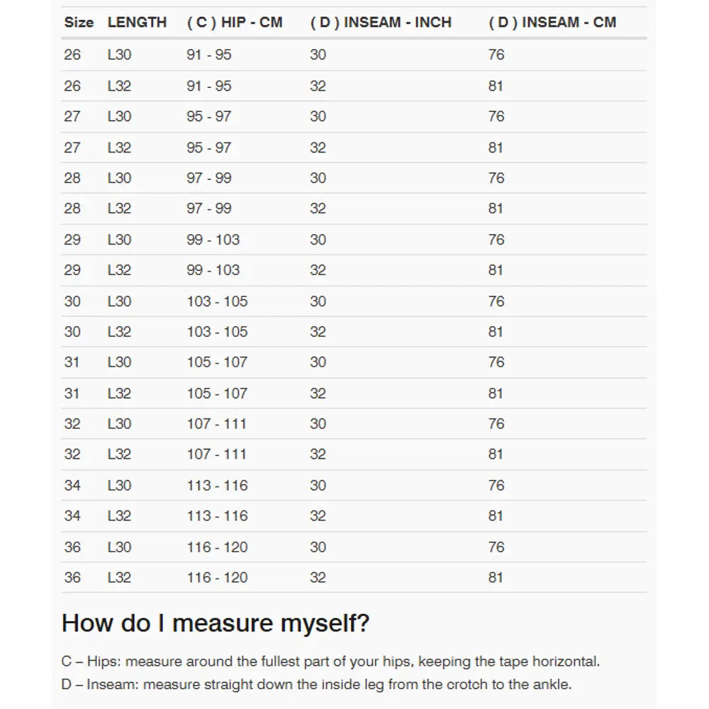 - Avsmalnande passform: rymligare vid låren, smalare från knät och nedåt