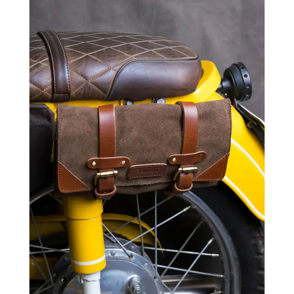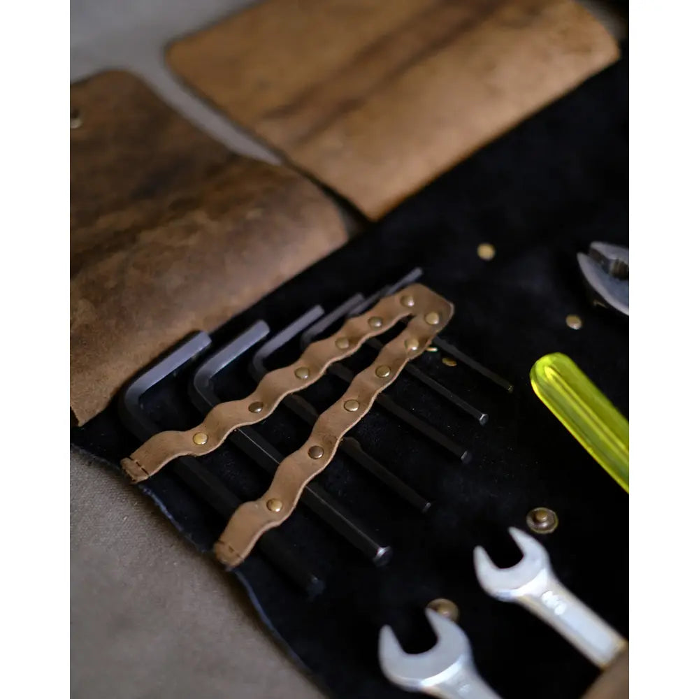 Trip Machine Leather verktygsväska är en handgjord och slitstark tool roll för dig som vill vara förberedd på vägen. Tillverkad i 100 % äkta läder med vattenresistent mockafinish och rå, hållbar konstruktion utan plast eller billiga material. Med gott om dedikerade fack för de viktigaste verktygen och en dragkedjeficka för småsaker håller den ordning på utrustningen och fästs enkelt direkt på hojen med läderremmarna.